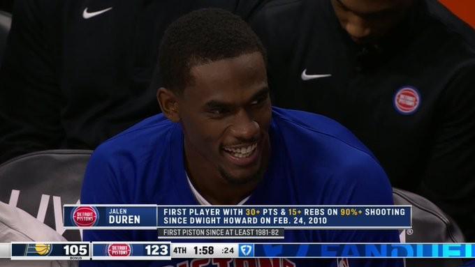 本場比賽,活塞隊中鋒杰倫-杜倫13投12中砍下31分15籃板3助攻,罰球11投7中。他成為了NBA歷史上最年輕的單場砍下30分15籃板且投籃命中率達(dá)到90%的球員。同時他也是自2010年德懷特-霍華德以來首位在單場比賽中達(dá)成此成就的球員。