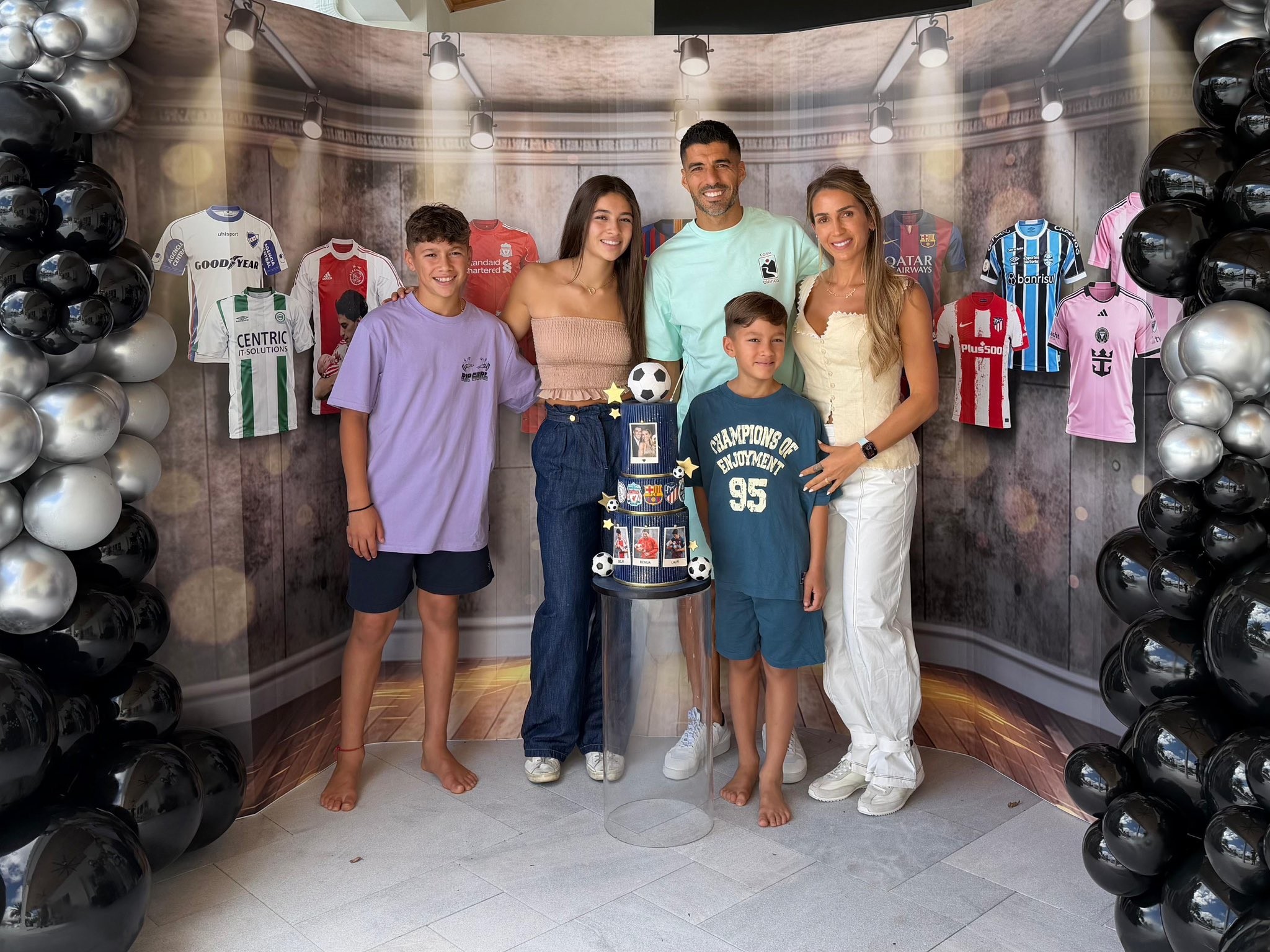 蘇亞雷斯與家人一同慶祝39歲生日,背景為效力過球隊(duì)的球衣