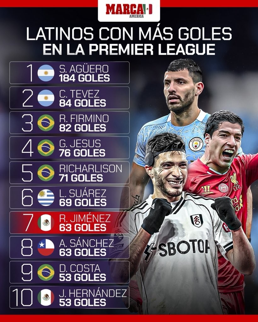 英超拉美球員射手榜:阿圭羅184球第1,希門(mén)尼斯63球升至第7