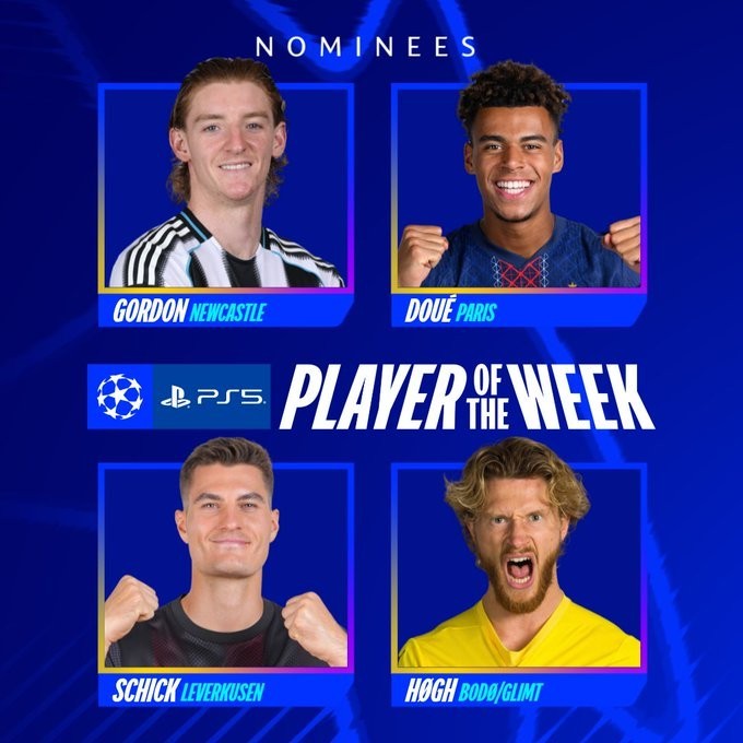 歐冠官方本周最佳陣:戈登、杜埃領(lǐng)銜 瓊阿梅尼、霍格、萊爾森在列