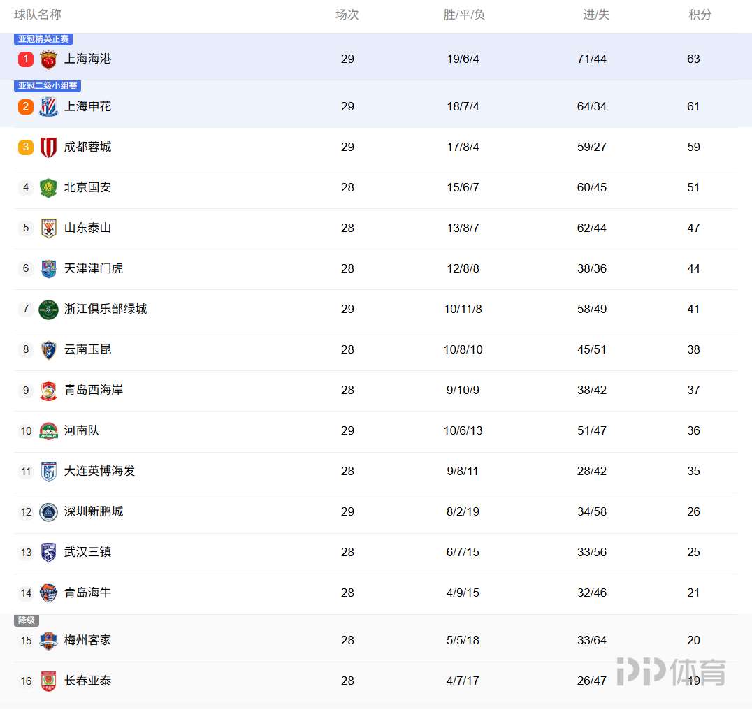 中超積分榜:海港剩1輪領(lǐng)先申花2分,蓉城輸球僅剩亞冠席位可爭(zhēng)