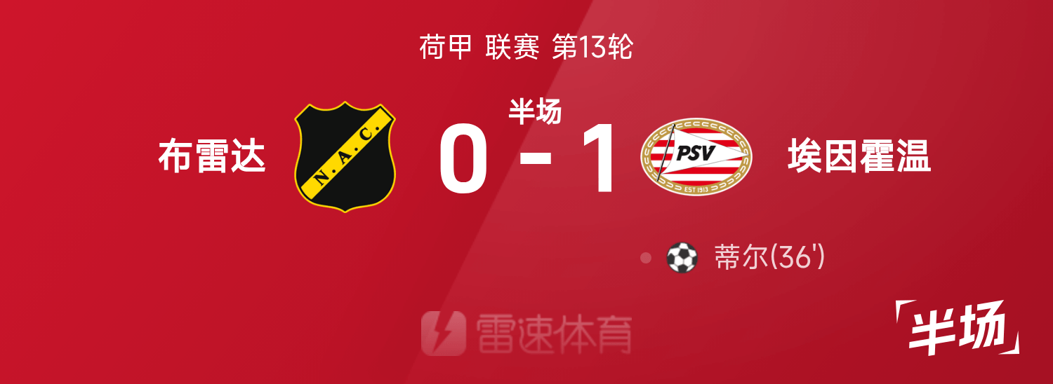 雷速體育11月23日訊 25/26賽季荷甲聯(lián)賽第13輪,布雷達(dá)迎戰(zhàn)埃因霍溫。半場(chǎng)戰(zhàn)罷,雙方比分暫為布雷達(dá)0-1埃因霍溫,蒂爾破門建功。