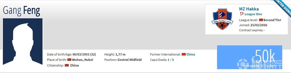 馮剛現(xiàn)年32歲,司職中場,此前球員效力于青島西海岸,期間共出場60次,打進2球助攻8次?,F(xiàn)在他在德轉(zhuǎn)上的身價為5萬歐元。